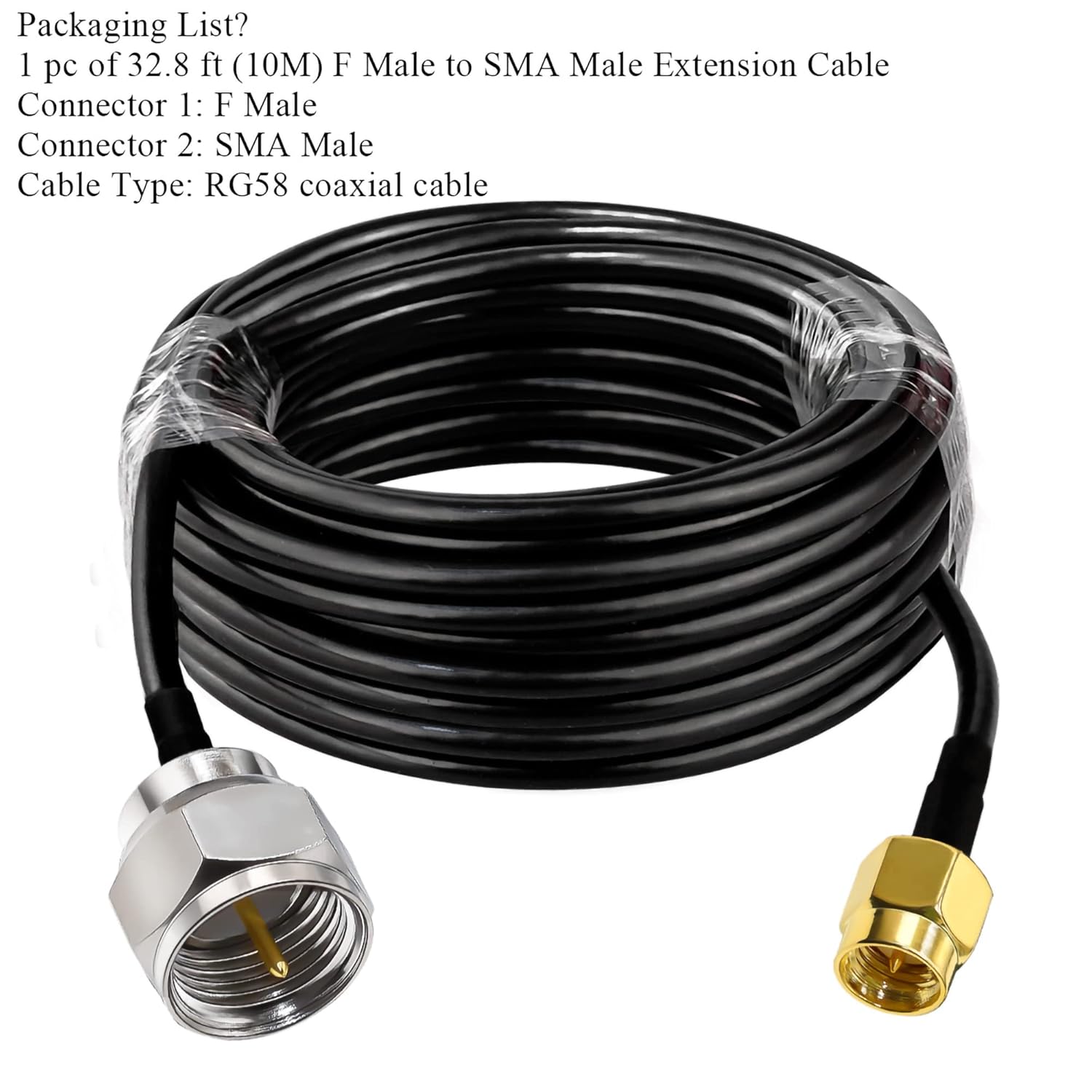 - Cable Type and Details: SMA to F coaxial cable; Cable type: RG58; Conductor Material: pure copper; Cable length: 32.8ft(10M); Impedance: 50 ohm, Low-loss
